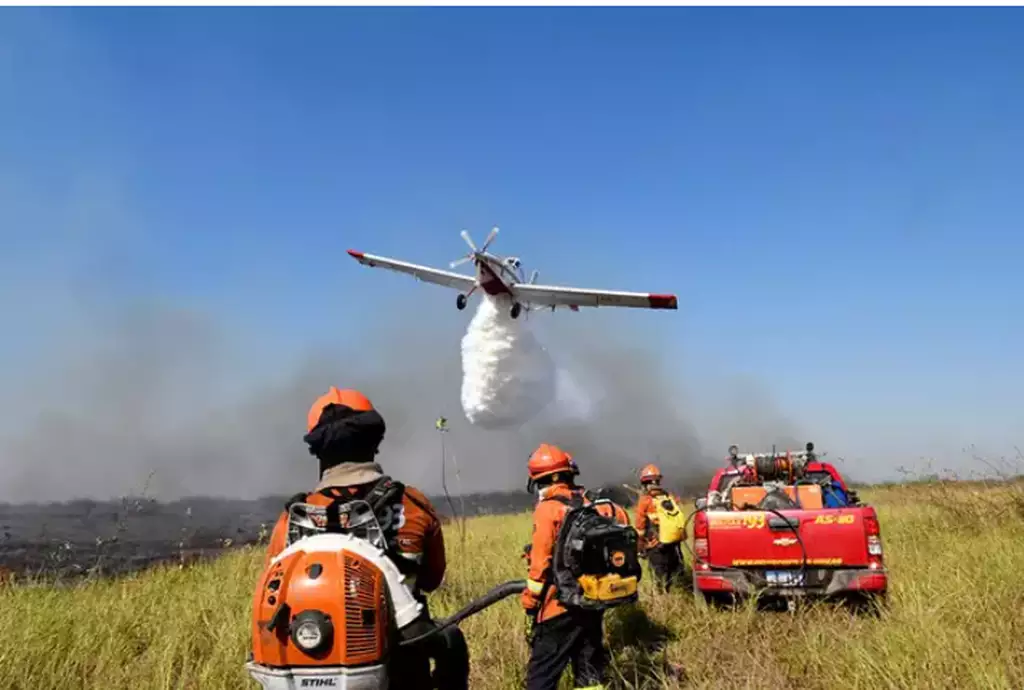 Aeronave durante combate ao fogo no Pantanal, em 2024. (Foto: Bruno Rezende).