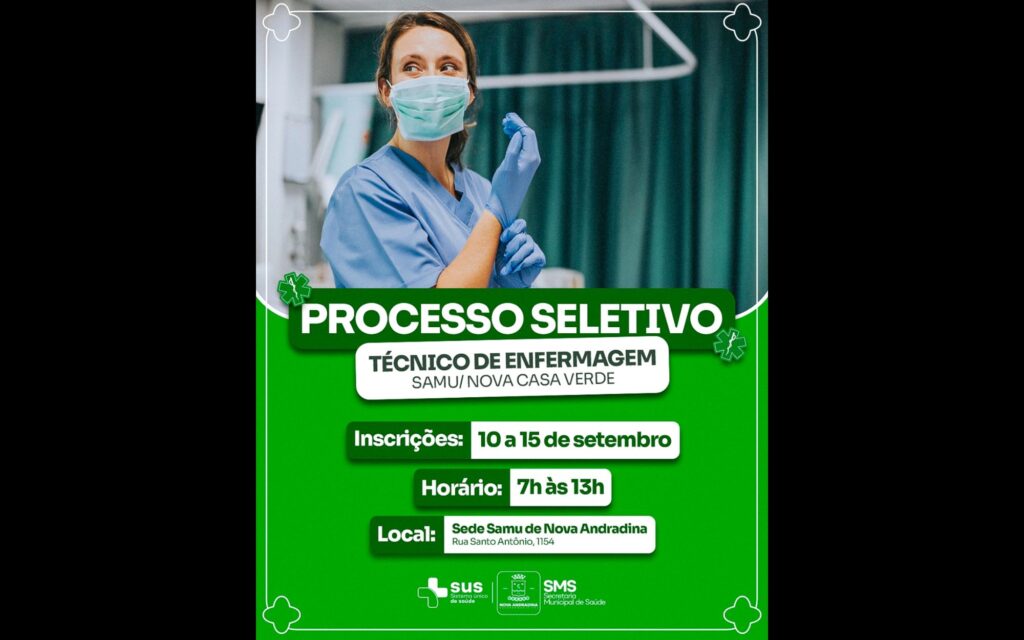 O contrato será firmado por tempo determinado de seis meses, com possibilidade de prorrogação por igual período. As inscrições estarão abertas até o dia 15 de setembro, e devem ser realizadas das 7h às 13h na sede do SAMU de Nova Andradina, localizada na Rua Santo Antônio, 1154.