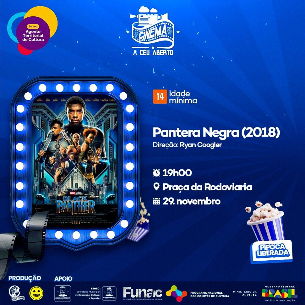 Às 19h, o público poderá acompanhar a exibição do filme Pantera Negra (2018), dirigido por Ryan Coogler e com classificação indicativa de 14 anos. Reconhecido como um marco do cinema mundial, o longa integra a proposta de oferecer obras relevantes, de fácil acesso e com forte impacto social e artístico. A sessão contará com distribuição gratuita de pipoca.