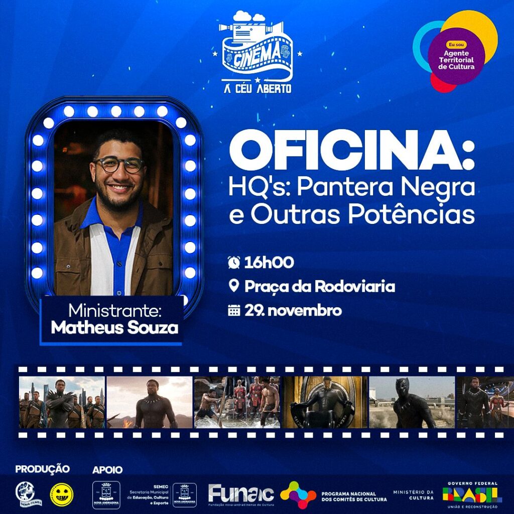 A Praça da Rodoviária será o ponto de encontro de mais uma edição do Cinema a Céu Aberto no próximo sábado (29). A programação, realizada em parceria com o Projeto Gema, tem início às 16h, com a oficina “HQs: Pantera Negra e Outras Potências”, ministrada por Matheus Souza. A atividade propõe uma imersão no universo dos quadrinhos sob uma perspectiva contemporânea, explorando narrativas que dialogam com identidade, tecnologia e diferentes imaginários culturais.