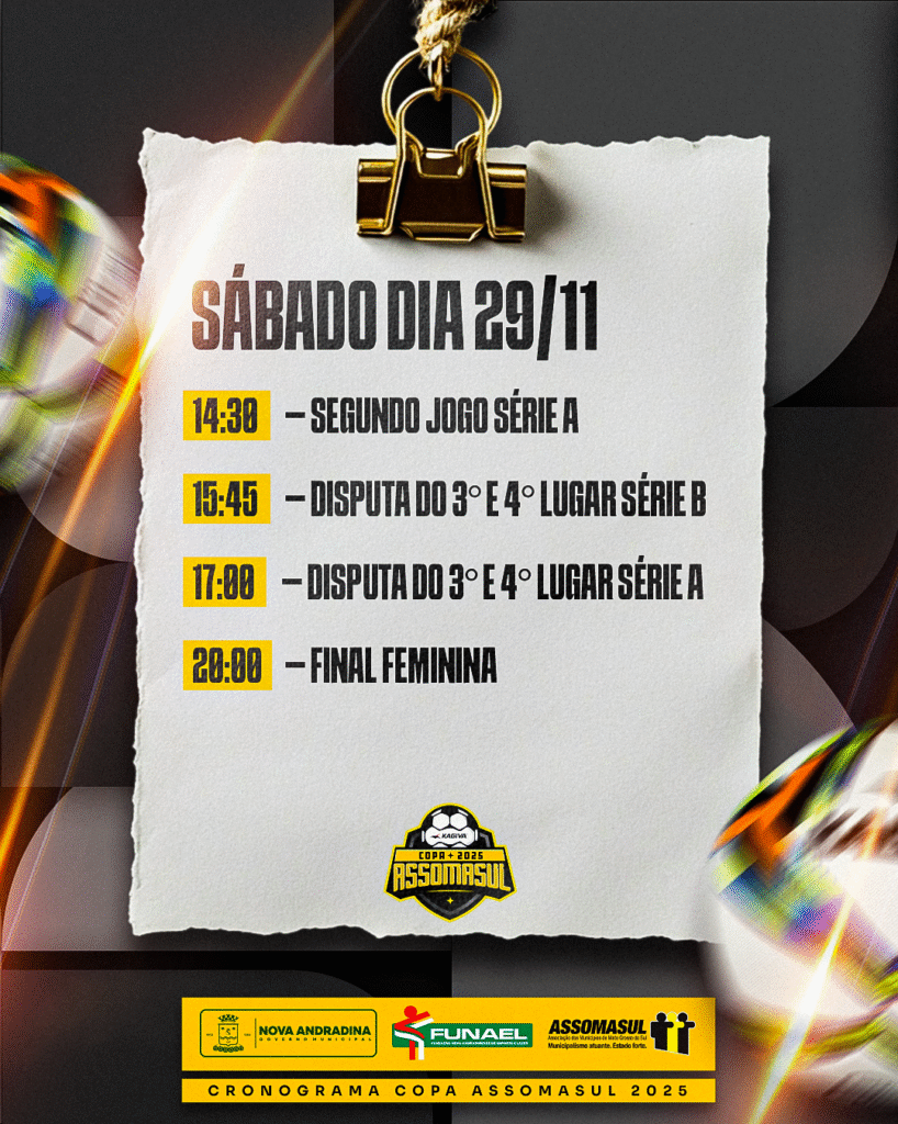 No período da tarde, a emoção continua. Às 14h30 acontece o segundo jogo da Série A; às 15h45, a disputa de 3º e 4º lugar da Série B; e às 17h, a definição do 3º e 4º lugar da Série A. À noite, às 20h, o duelo feminino entre Campo Grande e Caarapó promete encerrar o sábado em clima de grande decisão.