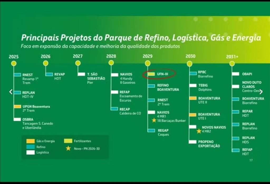 No novo gráfico exibido pela empresa, o projeto aparece entre as entregas previstas para 2029. A versão apresentada em 2024 previa início das operações em 2028. Esta é a primeira revisão do cronograma desde o anúncio do retorno da UFN-3 à carteira de implantação, feito no ano passado.