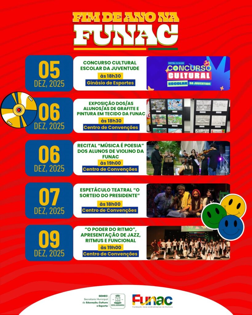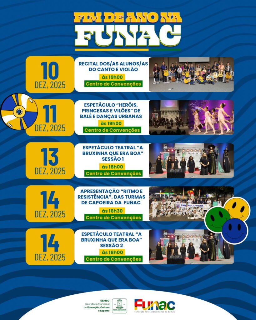 A Fundação Nova-Andradinense de Cultura (FUNAC) promove, entre os dias 6 e 14, uma extensa programação que marca o encerramento das oficinas culturais e demais atividades realizadas ao longo de 2025. Ao longo da semana, o Centro de Convenções “Sílvio Ubaldino de Sousa” receberá uma série de apresentações e mostras que evidenciam o talento e a evolução dos alunos atendidos pela fundação, incluindo exposições, teatro, balé, recital de violão e violino, além de capoeira.